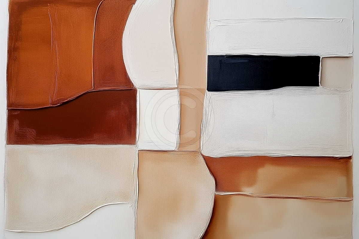 Ce tableau abstrait montre des formes géométriques aux bords doux dans des couleurs chaudes comme rouille, ocre, beige et blanc cassé, avec un rectangle noir pour contraste. La surface est lisse avec de légères couches, donnant un mouvement subtil. Les formes arrondies rencontrent des angles nets, alliant fluidité et structure. Les couleurs apportent chaleur et calme, et la composition crée équilibre. C’est une option simple et forte pour des pièces modernes et accueillantes.