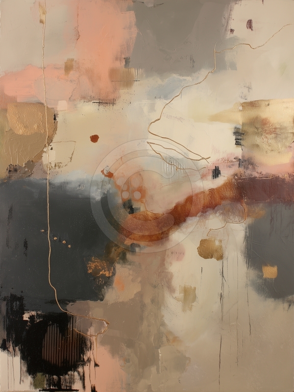 Ce tableau montre une composition abstraite avec des tons neutres et doux. Les textures en couches et les lignes fines creent un equilibre et un leger mouvement. Les contrastes simples entre les zones claires et sombres donnent de la profondeur sans etre forts. Les touches chaudes et naturelles ajoutent un aspect simple et actuel. L ensemble parait calme et invite a une reflexion tranquille.