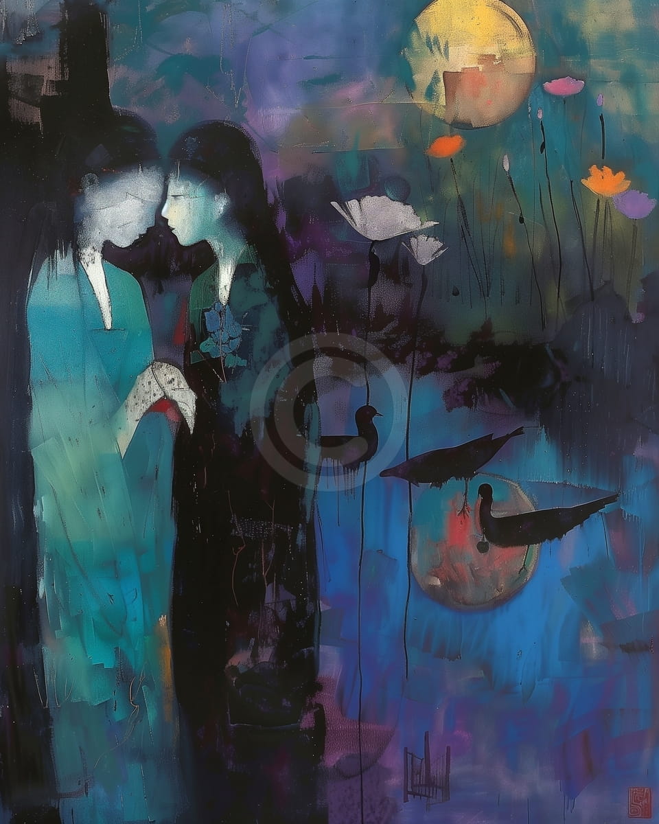 Ce tableau montre le lien proche entre deux sœurs jumelles japonaises dans une scène éclairée par la lune. Leurs silhouettes fines, peintes en bleus doux et en violet profond, se mélangent au paysage léger et rêveur. L’ambiance est calme, avec une touche de mystère et d’émotion discrète. La lune brillante, les fleurs de lotus et les ombres d’oiseaux ajoutent de la profondeur à l’image. La scène évoque l’harmonie, la réflexion et le passage du temps, et invite le spectateur à entrer dans un moment paisible et hors du temps.
