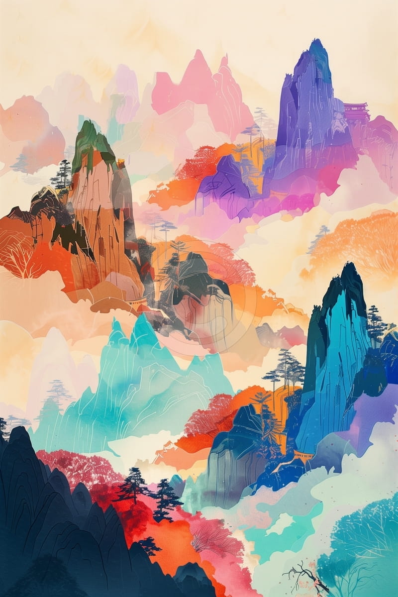 Ce tableau montre un paysage traditionnel chinois, où des montagnes embrumées s’élèvent majestueusement dans une riche harmonie de couleurs. S’inspirant de la peinture classique à l’encre, l’artiste réinterprète la scène avec des tons intenses de bleu, d’orange, de rouge et de violet, créant une atmosphère éthérée et rêveuse. De fins arbres se dressent sur les falaises rocheuses, tandis que les sommets lointains se fondent doucement dans la brume, ajoutant profondeur et mystère. Le contraste de lumière et d’ombre, associé à des détails soignés, exprime la beauté intemporelle de la nature et le caractère poétique de l’art chinois.