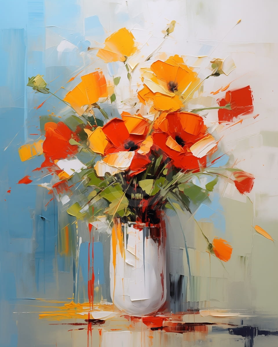 Ce tableau montre un beau bouquet de coquelicots rouges et orange dans un vase blanc simple. Les coups de pinceau forts et avec texture font paraître les fleurs vivantes et pleines de mouvement, comme si elles bougeaient dans une brise légère. Les couleurs chaudes des pétales ressortent bien sur le fond abstrait aux tons froids, créant une image vivante et équilibrée. Le mélange de couleur et de texture donne une sensation de chaleur et de beauté naturelle. Le tableau ressemble à une célébration claire de l’élégance simple des fleurs.