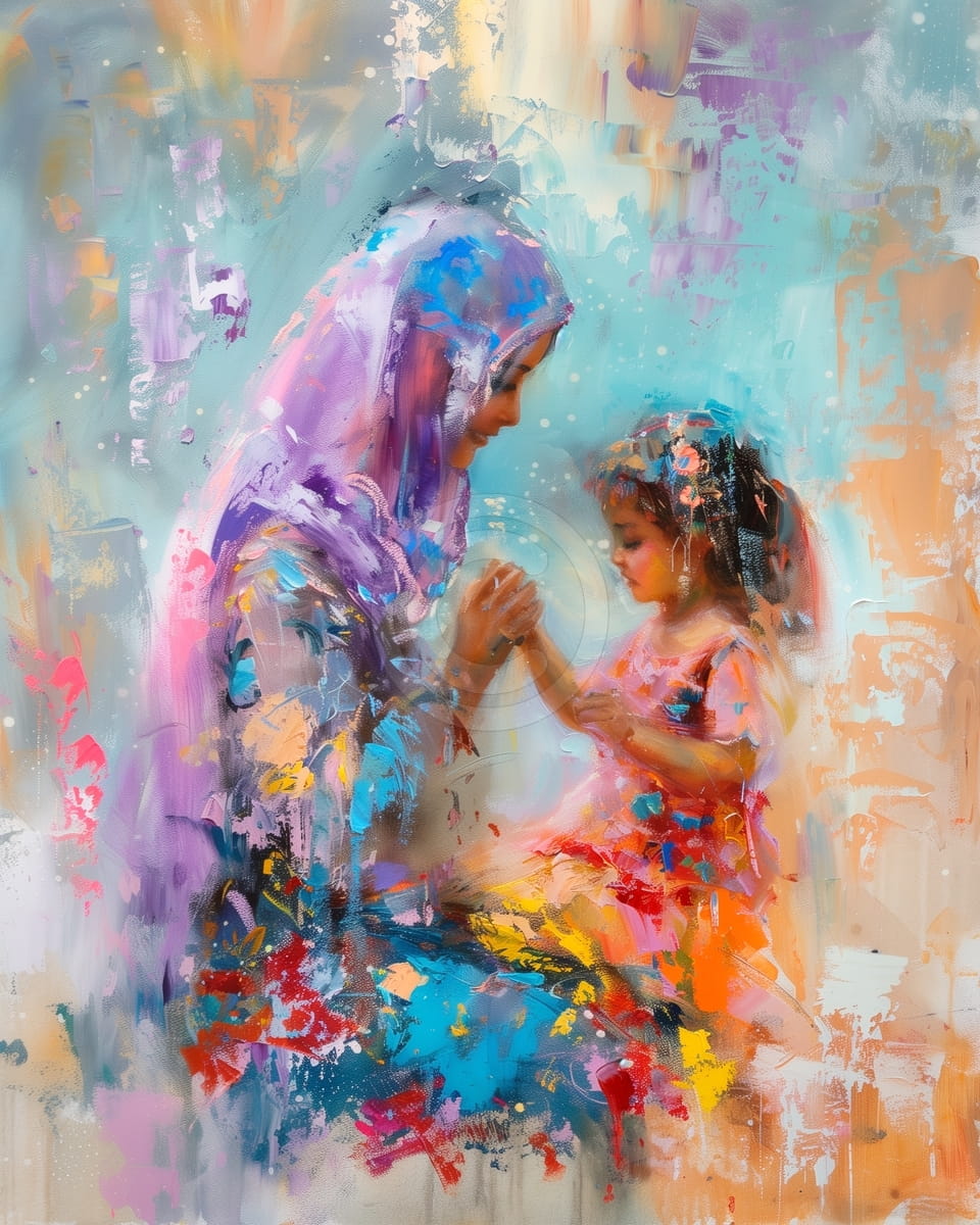 Cette œuvre émouvante et expressive montre le lien fort entre une mère et sa fille, avec des couleurs vives bleu, violet et des tons orange chauds. Le visage doux de la mère, entouré par son voile fluide, montre la chaleur et la protection, tandis que la petite fille, avec une robe colorée, montre l’amour et la confiance. Les coups de pinceau abstraits donnent du mouvement à l’image et suggèrent le flux naturel de l’amour et de la protection. Ce tableau montre des thèmes d’amour familial, de foi et de lien profond. C’est une composition émotionnelle et visuellement forte.