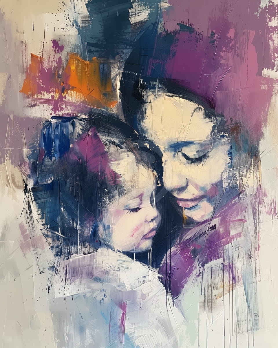 Cette peinture émouvante montre le lien fort entre une mère et son enfant. Les coups de pinceau abstraits et la riche palette de bleus profonds, violets et touches chaudes soulignent la tendresse du moment. La fusion douce des visages transmet amour, protection et chaleur, faisant de l’œuvre une représentation touchante de l’affection maternelle. Les textures apportent profondeur et mouvement, renforçant l’émotion de la scène.