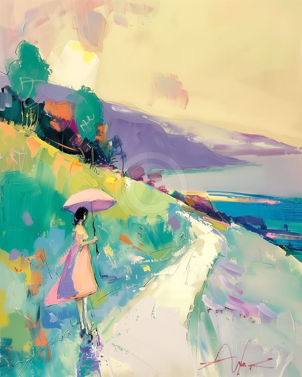 Ce tableau abstrait de paysage rural montre une atmosphère douce et calme en utilisant des couleurs pastel et des coups de pinceau visibles. Une silhouette solitaire avec un parapluie marche sur un chemin courbé qui va vers l’horizon, donnant une sensation de tranquillité et de réflexion. Les collines ondulées, peintes en verts intenses et violets, ressortent devant le ciel doré chaud et créent une scène équilibrée mais vivante. La lumière et le mouvement semblent circuler naturellement sur la toile, donnant vie au paysage. L’œuvre paraît calme, chaleureuse et naturelle à regarder.