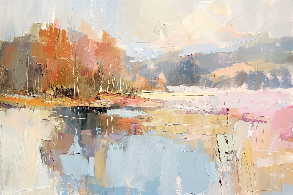 Ce tableau de paysage lacustre montre une scène naturelle calme avec des teintes automnales chaudes qui se reflètent dans l’eau. Les coups de pinceau libres et visibles créent une sensation de mouvement doux. Les teintes pastel en arrière-plan suggèrent une atmosphère paisible et légèrement brumeuse. Le contraste entre le feuillage doré et les tons profonds de bleu et de gris du lac aide à donner plus de profondeur à l’image. Dans l’ensemble, le tableau crée une scène naturelle sereine et agréable.