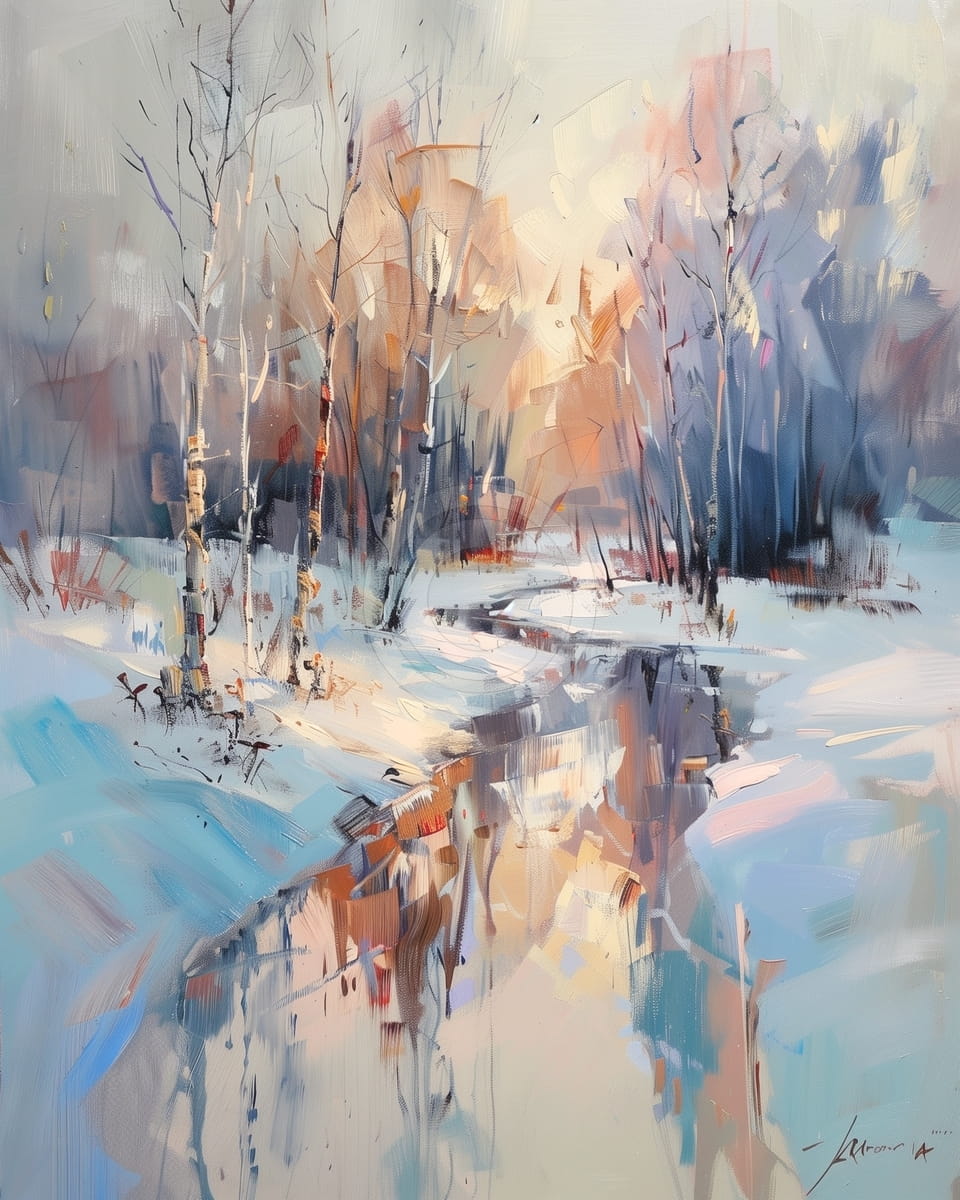 Ce tableau montre un paysage hivernal calme avec une rivière de montagne qui coule lentement dans une forêt couverte de neige. La peinture est appliquée avec des coups de pinceau visibles et expressifs, en utilisant un mélange équilibré de tons chauds et froids. Une lumière dorée douce passe entre les arbres et se reflète sur la surface de l’eau glacée. Le style impressionniste abstrait donne à l’image un effet doux et légèrement irréel. Dans l’ensemble, le tableau crée une atmosphère hivernale calme et silencieuse.