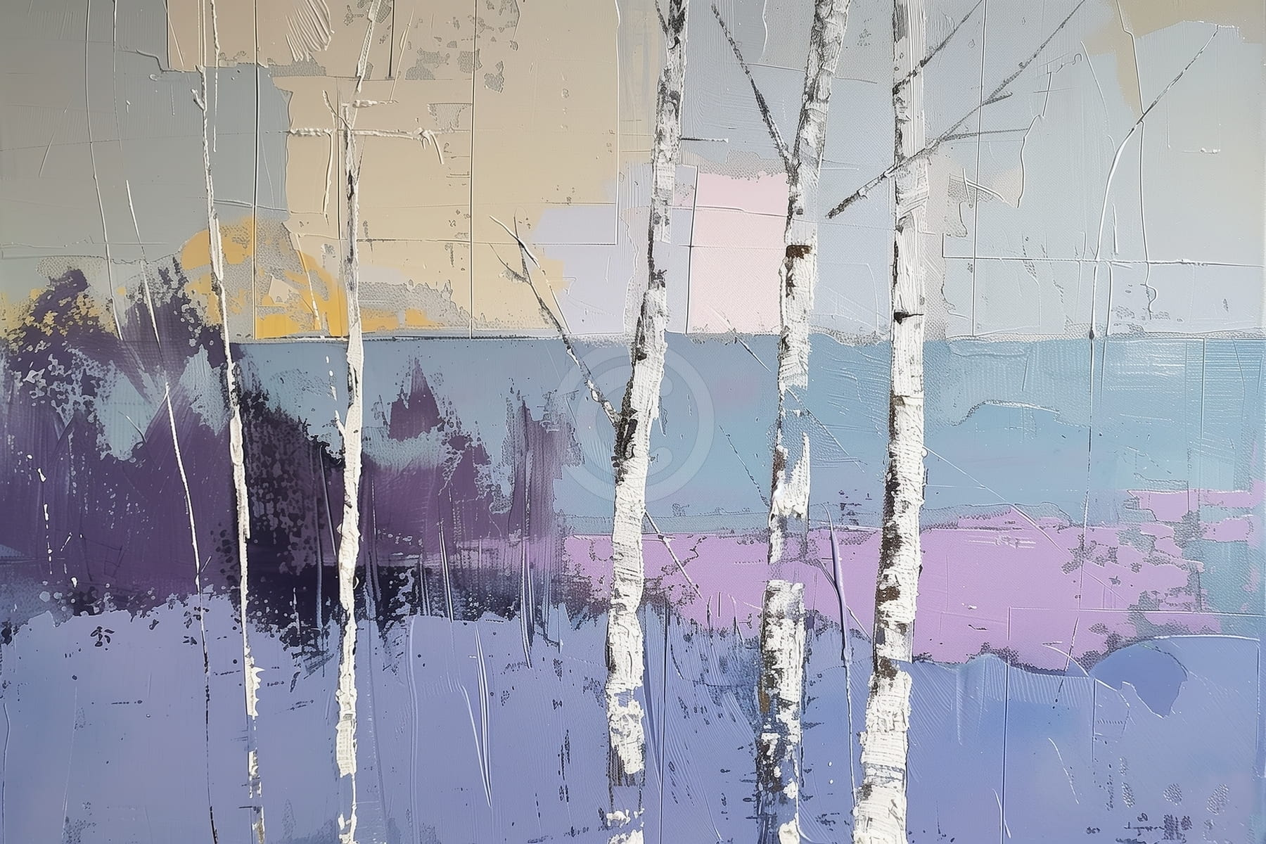 Ce tableau montre une forêt de bouleaux réalisée avec des coups de couteau à palette audacieux, qui créent une texture et une profondeur visibles. Les fins troncs blancs se détachent clairement sur un arrière-plan superposé de bleus, violets et douces nuances dorées. L’artiste utilise la couleur et la texture de manière expressive dans une composition abstraite, créant une atmosphère paisible mais vivante. La scène reflète la beauté sereine de la nature de façon décorative, adaptée à différents espaces intérieurs.