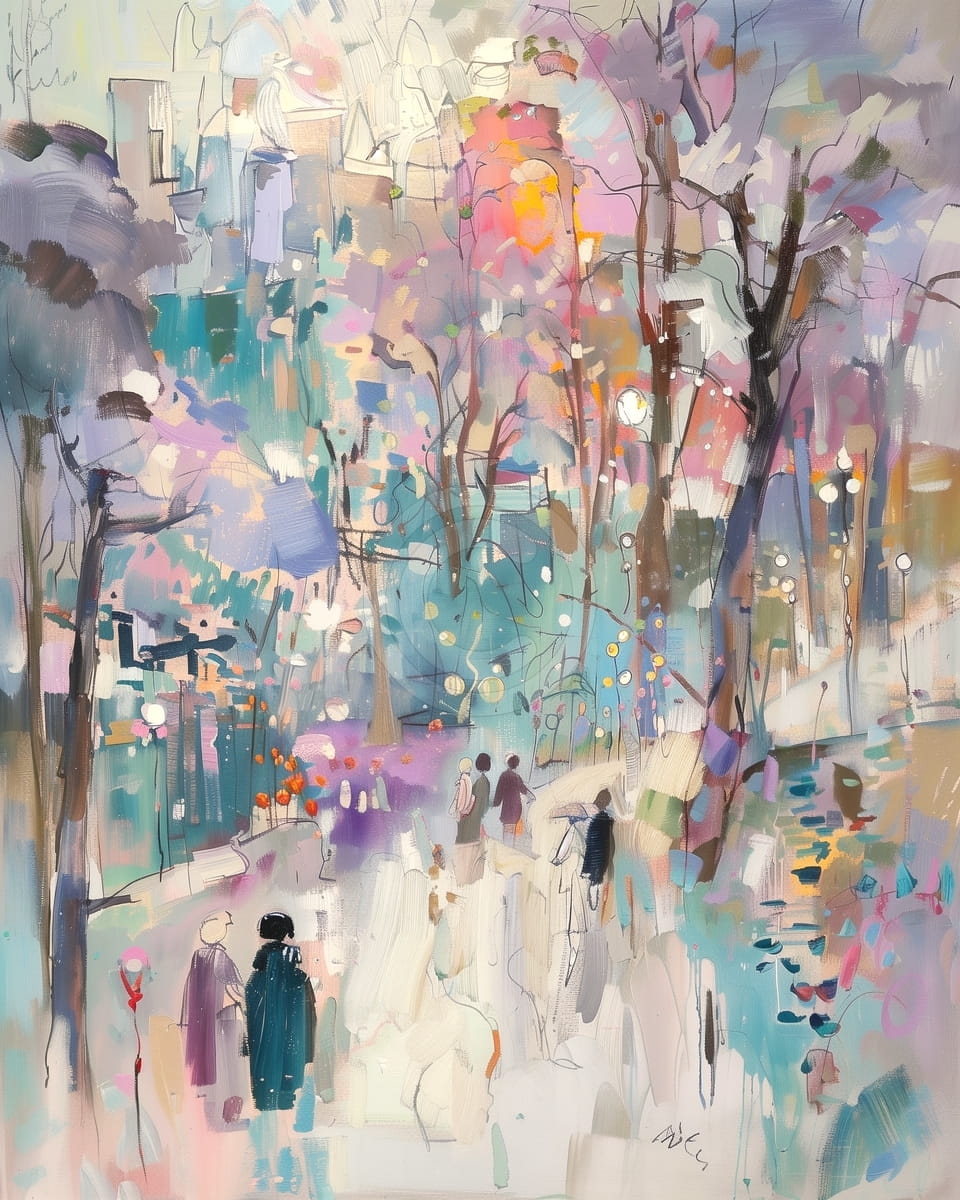 Ce tableau montre un paysage champêtre vibrant avec des couleurs douces et des coups de pinceau expressifs. De délicates silhouettes marchent le long d’un chemin légèrement éclairé, entourées d’arbres élancés avec des sphères lumineuses. Les teintes pastel se mélangent à des bleus profonds, violets et touches dorées chaudes, créant une atmosphère magique et presque festive. La composition dynamique rend la scène vivante mais paisible, capturant le charme d’un environnement rural de façon décorative et agréable.