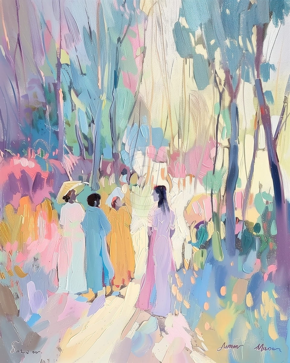 Ce paysage de forêt en été montre une scène calme et de rêve avec des couleurs pastel douces et des touches de pinceau fluides et légères. Les personnes, vêtues de habits légers et flottants, se déplacent lentement à travers la forêt ensoleillée, transmettant un sentiment de paix et de tranquillité. La lumière qui filtre entre les arbres crée un éclat chaud et doux, rendant l’atmosphère sereine et légère. La peinture montre l’harmonie entre la nature et les humains, évoquant une ambiance douce et nostalgique. Les couleurs délicates et les silhouettes gracieuses rendent la scène élégante et accueillante, pleine du charme et de la tranquillité de l’été.