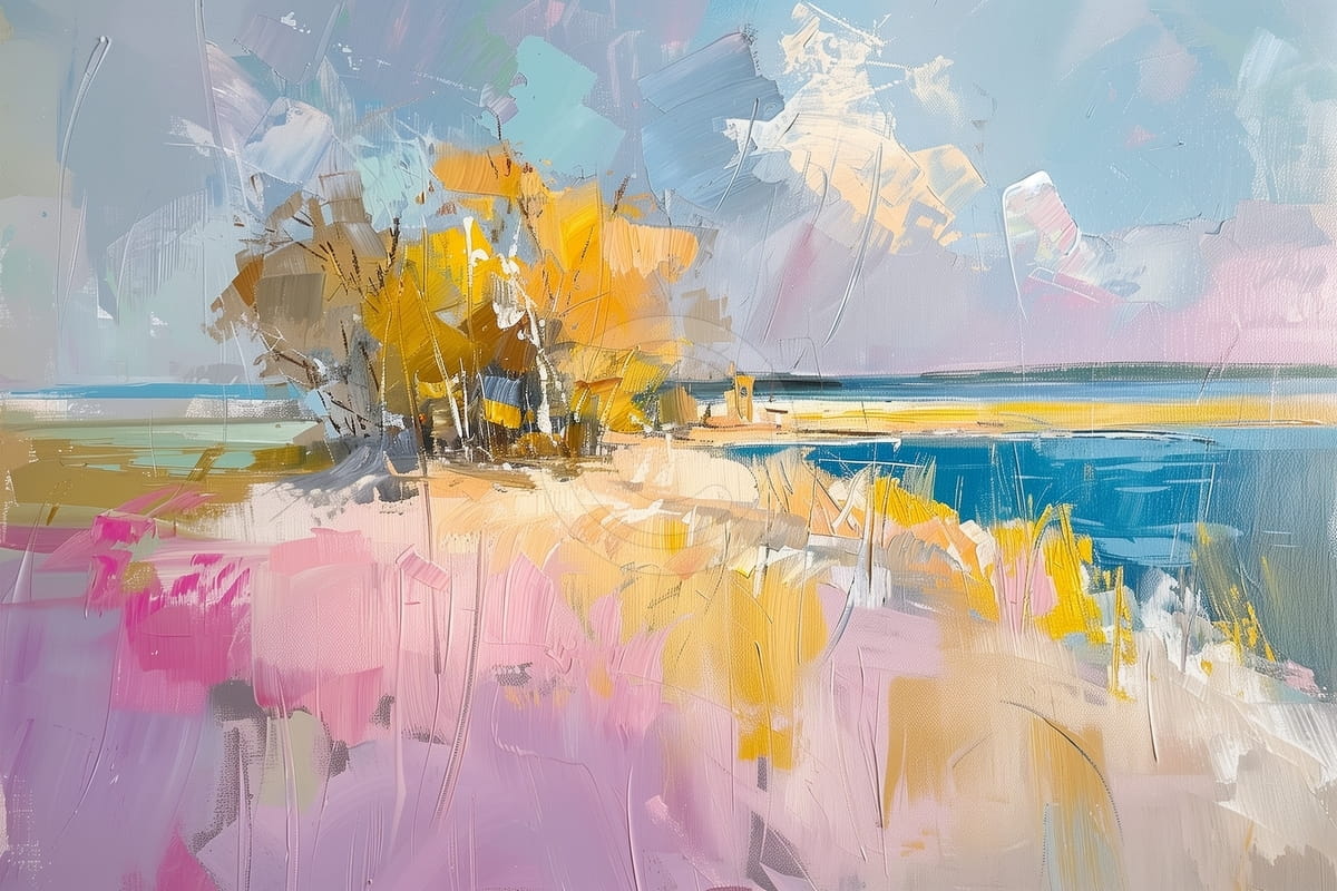 Ce tableau montre un paysage au début de l’automne. Les couleurs dorées se mélangent avec des roses et bleus pastel, créant une sensation de calme et de douceur. Les coups de pinceau donnent du mouvement au paysage venté, avec des arbres aux feuilles dorées sous un vaste ciel. Le mélange de couleurs chaudes et froides montre le passage de l’été à l’automne, tandis que l’eau à l’arrière-plan ajoute profondeur et tranquillité. L’œuvre transmet calme et changement, idéale pour évoquer nostalgie et chaleur.