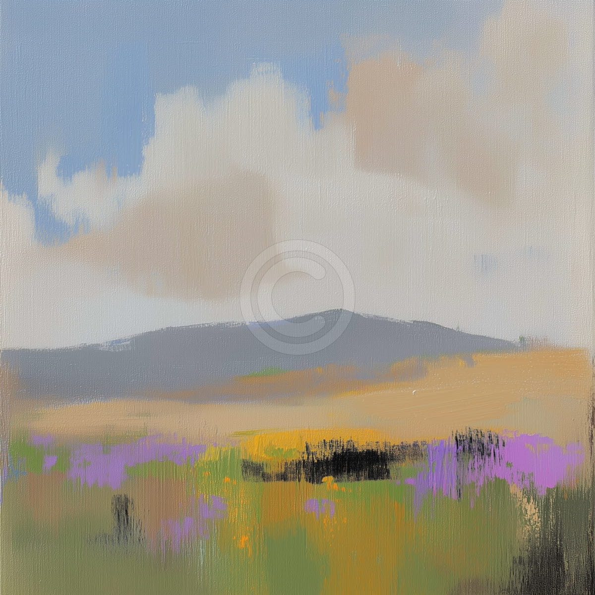 Ce tableau montre la beauté calme d’un paysage paisible, où des champs dorés et verts vont jusqu’à une montagne au loin. De petites touches de fleurs sauvages violettes et jaunes apportent de la couleur et un charme simple au premier plan. Le ciel, peint en bleu clair et en tons neutres chauds, a des nuages légers qui renforcent l’atmosphère tranquille. Les détails simples et les contours un peu flous créent une sensation de calme et invitent le spectateur à s’arrêter pour profiter de ce moment de paix.