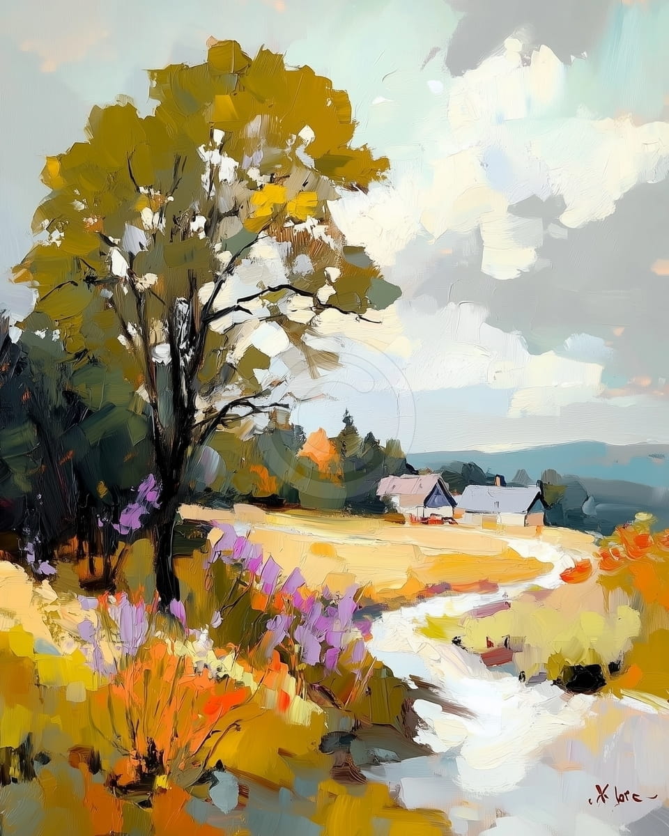 Un tableau rural calme montre un chemin qui tourne et mène à des maisons au loin sous un ciel couvert. Un grand arbre en vert et doré se tient près de fleurs sauvages en violet et orange. Les coups de pinceau sont épais et visibles, montrant la lumière et un léger mouvement. Le paysage s’ouvre doucement vers l’horizon, donnant une impression d’espace et de vie simple. Les nuages clairs contrastent avec les couleurs chaudes du sol. Le tableau transmet une idée de nature, de simplicité et de repos.