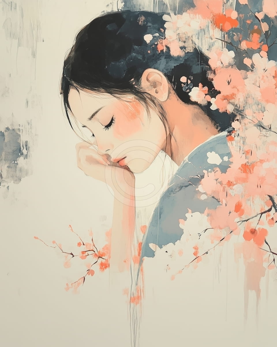 Ce tableau montre une jeune fille les yeux fermés, avec la main posée doucement sur ses lèvres, dans un moment de calme et de réflexion. Ses cheveux foncés se mélangent à l’arrière-plan, où des fleurs de cerisier en tons corail et rose l’entourent délicatement. Les couleurs pastel et l’effet proche de l’aquarelle donnent une sensation de simplicité et de tranquillité. Les touches légères et les changements doux de couleur rendent l’image douce et agréable à regarder. C’est une image qui unit la beauté de la nature avec un sentiment de paix et de douceur.