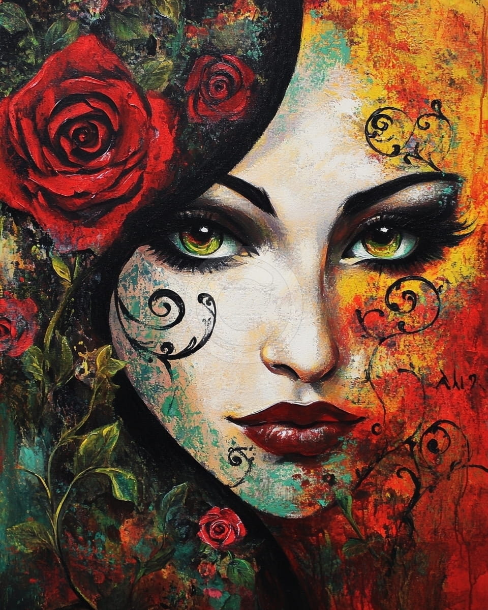 Ce tableau vif et original montre le visage marquant d’une femme aux yeux verts brillants et aux lèvres rouges foncées. Elle est entourée de roses ouvertes et de formes en spirale. Son expression est mystérieuse et attirante, mêlant beauté et un léger côté spirituel. Les couleurs rouge, or, vert et noir créent un contraste fort et une émotion claire. Le côté gauche de son visage sort d’une ombre sombre avec des fleurs, tandis que le côté droit brille avec des couleurs chaudes. Les lignes en spirale sur son visage et les fleurs qui semblent pousser de sa peau donnent à l’image un aspect magique et différent.