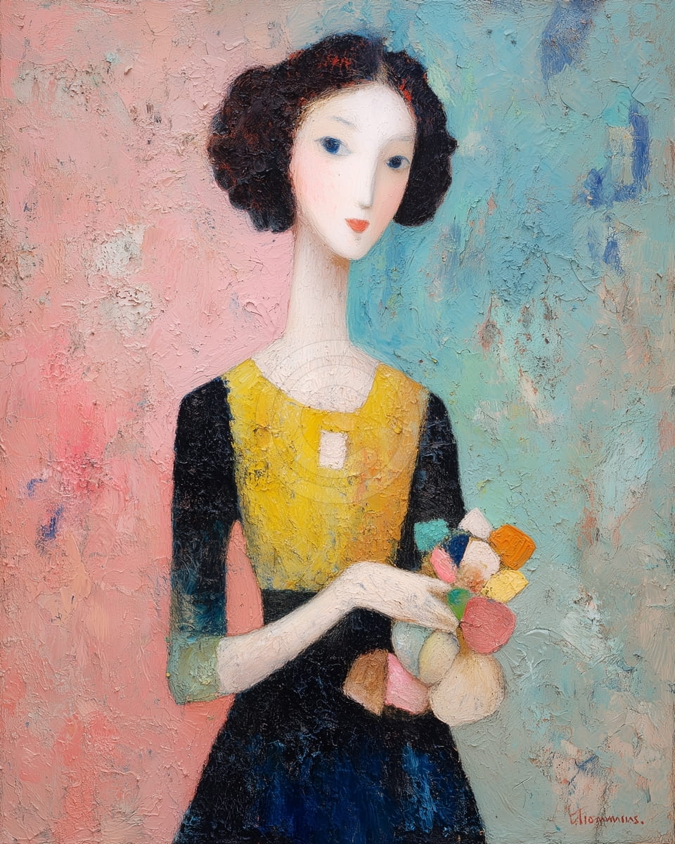 Ce tableau montre un portrait stylisé d’une jeune femme avec un visage et un cou longs et délicats. Elle porte une robe simple en jaune vif et bleu foncé ou noir. L’arrière-plan est divisé en zones texturées de rose et de sarcelle clair. Elle tient un petit bouquet abstrait de fleurs en blocs de couleurs vives. L’artiste utilise de la peinture épaisse sur toute la toile, ce qui donne une surface riche et presque sculptée. Le style est simple et populaire, avec une expression innocente et peu de détails sur le visage.