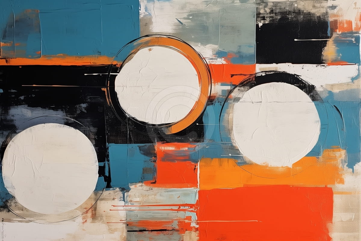 Questo quadro astratto moderno mostra tre forme circolari grandi su uno sfondo dinamico con forme geometriche forti. L’immagine usa soprattutto bianco, nero, blu e arancione, creando una sensazione di energia ed equilibrio. Le pennellate sono spesse e i colori sono messi in più strati, dando più profondità al quadro, mentre i cerchi sembrano galleggiare dentro il disegno. Il contrasto tra bordi netti e forme morbide crea una sensazione di movimento e ordine. Il quadro risulta un esempio forte di arte astratta contemporanea.