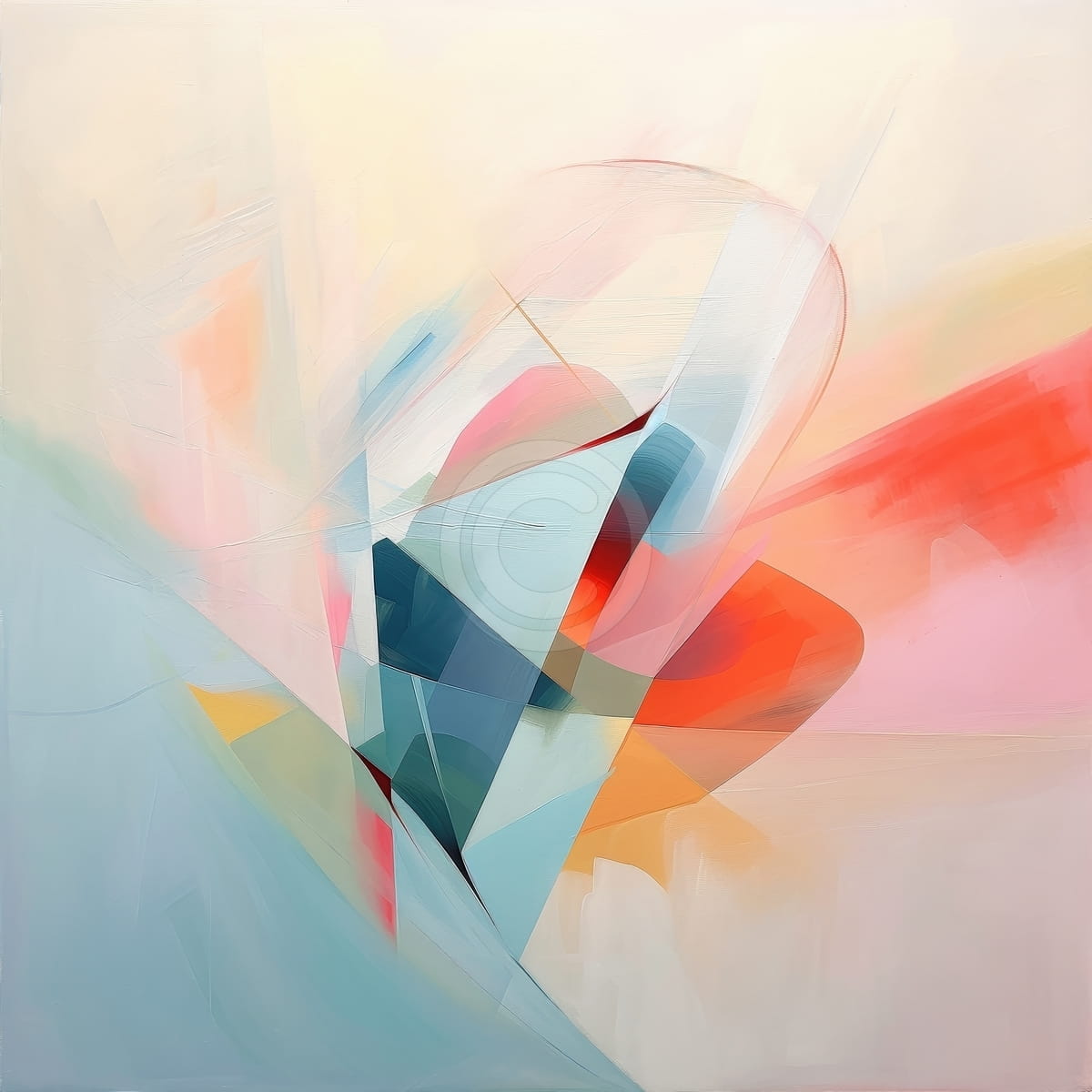 Questo dipinto astratto, intitolato "Trasparente", mostra fluidità e leggerezza attraverso una composizione morbida e dinamica. I toni freddi del blu, i caldi arancioni e i delicati pastelli creano un effetto etereo, quasi sospeso, come se la luce passasse attraverso vetro o acqua. Le forme geometriche e organiche si mescolano armoniosamente, suggerendo movimento e trasformazione. L’opera invita alla riflessione, simboleggiando chiarezza, apertura e la bellezza dell’impermanenza.