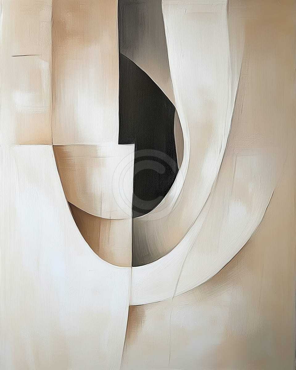 Questo quadro astratto mostra curve ampie e forme geometriche semplici in colori come avorio, beige caldo e nero. La composizione è fluida ma ordinata, guidando lo sguardo lungo archi e intersezioni. Luce e ombra danno profondità e forma. I colori neutri creano una sensazione calma e serena. È una scelta semplice e forte per stanze moderne e minimaliste.