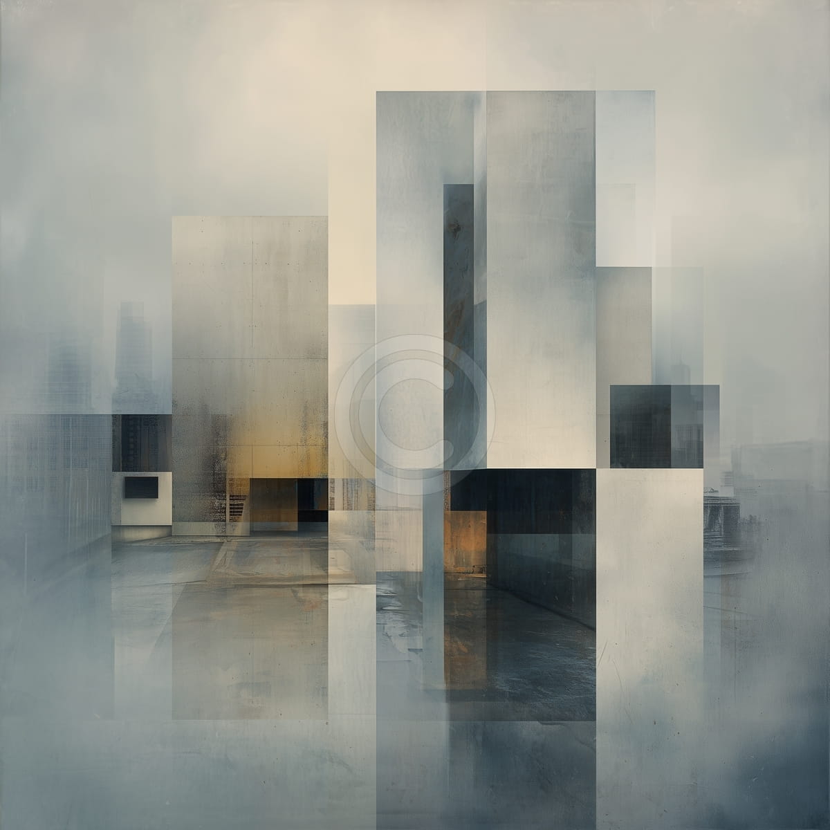 Piani geometrici e strati trasparenti creano una visione spezzata di una citta, dove le forme degli edifici si sovrappongono come immagini che cambiano. Toni morbidi di grigio, blu e oro chiaro danno alla scena un’atmosfera calma, come se fosse sospesa tra nebbia e luce. La composizione sembra ordinata ma leggera, mostrando lo spazio urbano in modo semplice attraverso forme e superfici.
