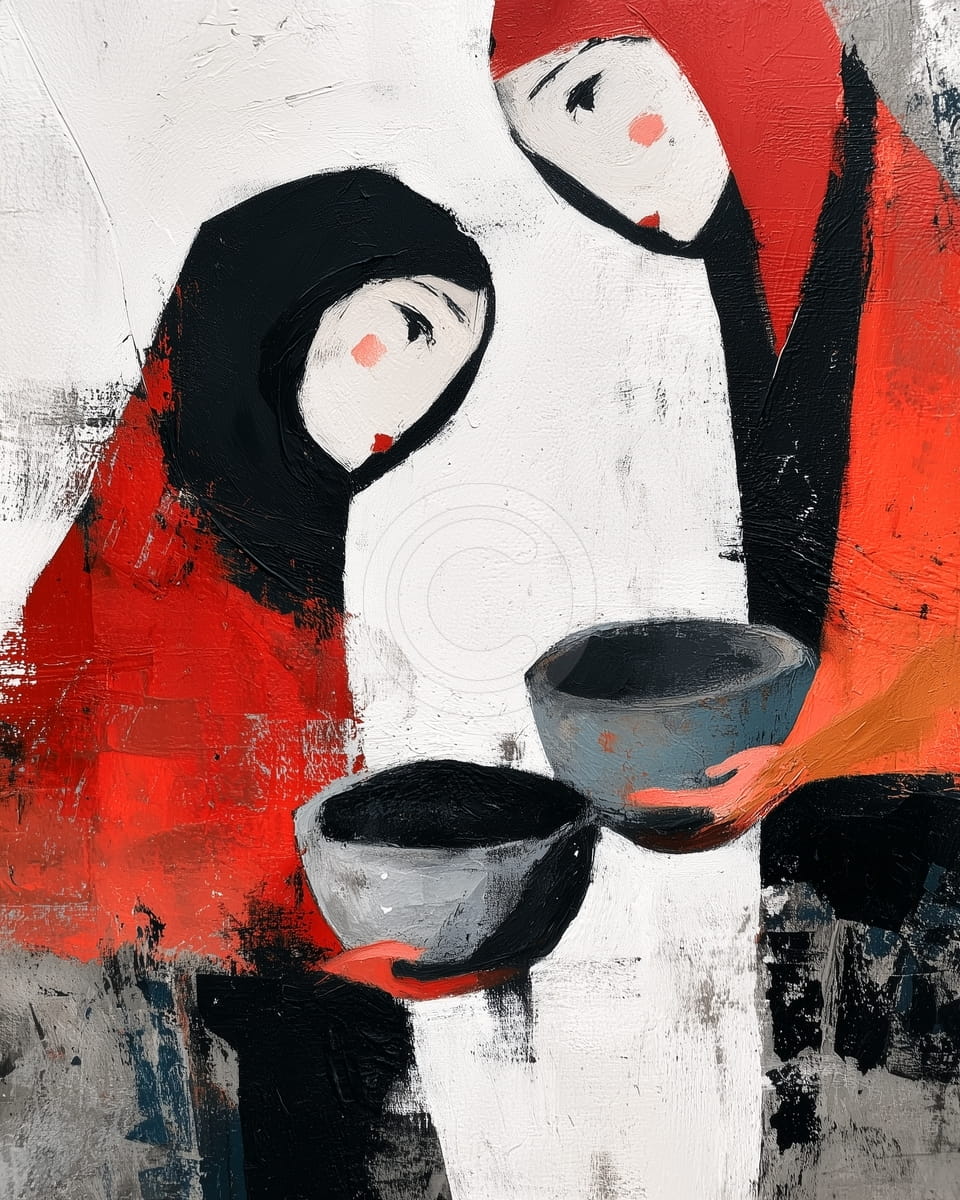 Questo quadro mostra due figure stilizzate in uno stile astratto e deciso, su uno sfondo prevalentemente bianco e molto materico. Entrambe indossano copricapi neri e abiti rosso vivo che risaltano nella composizione. I loro volti sono pallidi e con pochi dettagli, solo bocca e occhi leggermente accennati. Tengono piccole ciotole scure verso il centro della tela. L’artista usa pittura spessa e vivace sullo sfondo bianco, a contrasto con grandi aree piatte di rosso intenso. La composizione è chiara e grafica, mettendo in evidenza un momento di offerta o di azione condivisa.
