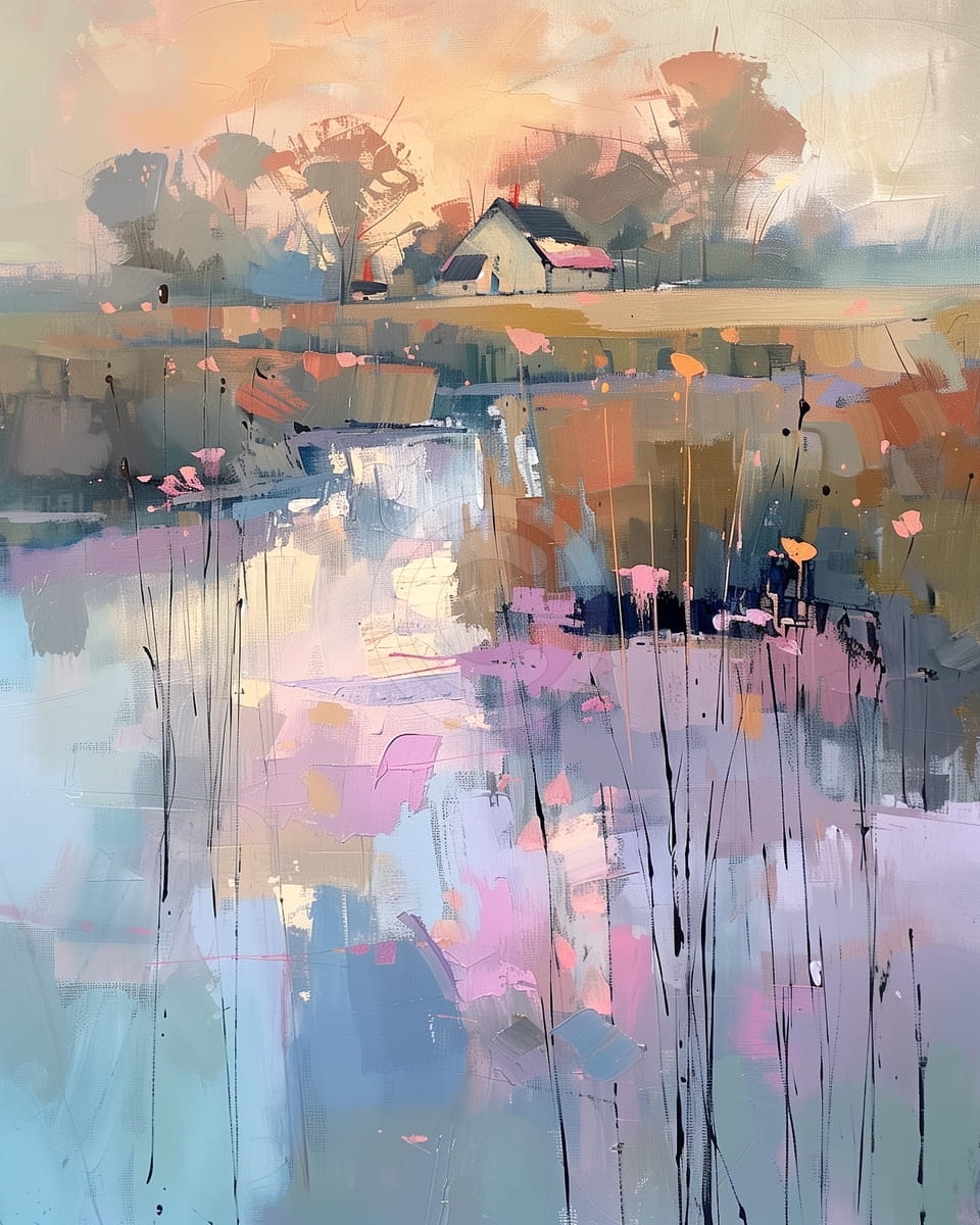 Questo quadro astratto di paesaggio rurale mostra una scena di campagna calda e tranquilla con una piccola casa tra gli alberi. I colori pastello morbidi come rosa, oro e blu sono mescolati con dolcezza, mostrando la campagna illuminata da una luce leggera. Le pennellate sono libere e i riflessi delicati nell’acqua aggiungono profondità e un leggero senso di movimento. Il mix tra stile astratto e impressionista crea un aspetto morbido e sognante. Il quadro trasmette una sensazione di pace e semplicità, mostrando la natura e la vita tranquilla insieme.