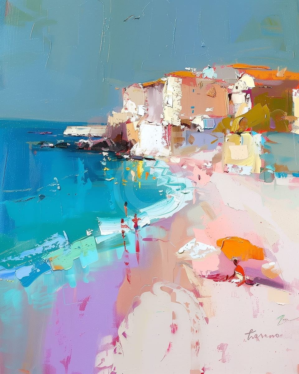 Questo quadro astratto vibrante mostra una bella spiaggia hawaiana, dove la sabbia dorata incontra l’acqua turchese luminosa dell’oceano. Le pennellate in rosa, blu e colori terra caldi aggiungono movimento ed energia, mostrando il carattere vivo di una costa piena di sole. Un piccolo villaggio sulle scogliere, illuminato da una luce morbida, aggiunge fascino e un leggero senso di ricordo. Le persone sulla spiaggia e gli ombrelloni colorati aggiungono calore e una sensazione di relax. Il quadro mostra un luogo tropicale pieno di bellezza e calma felice.
