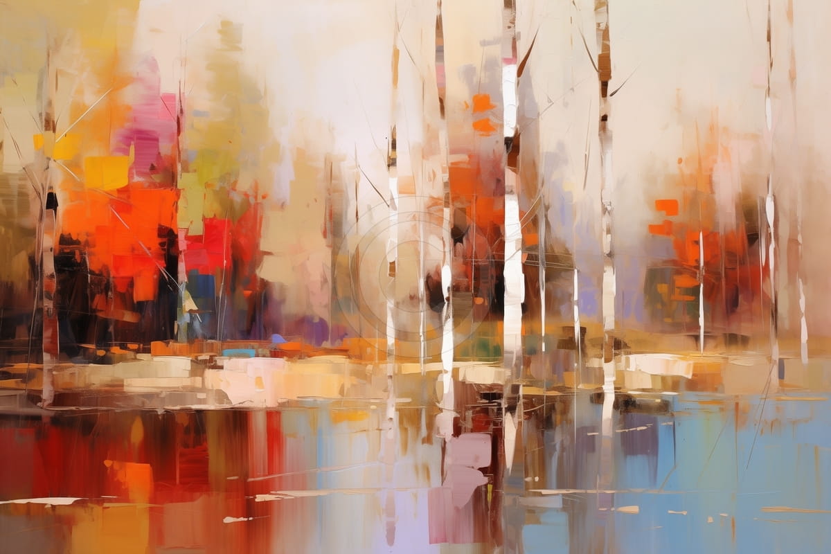 Questo quadro mostra un paesaggio autunnale con colori caldi riflessi in un’acqua tranquilla. Alti alberi di betulla si ergono eleganti, i tronchi bianchi contrastano con il rosso, l’arancione e il dorato delle foglie. Le pennellate espressive e gli elementi astratti danno movimento, trasmettendo l’aria fresca e la calma della stagione. Le delicate sfumature e la luminosità della scena rendono l’opera un bel omaggio alla bellezza dell’autunno.