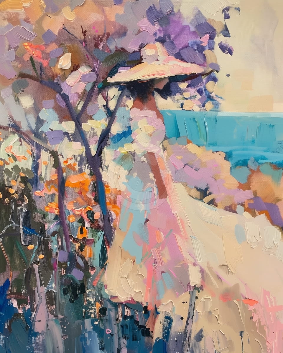 Questo quadro mostra una donna che cammina in un paesaggio dipinto con colori pastello chiari. Le pennellate ampie e visibili danno l’idea del movimento e rendono la scena fluida e naturale. L’atmosfera generale è calma e piacevole. Il mix tra colori caldi e freddi crea equilibrio visivo e armonia. Il cappello a tesa larga della donna aggiunge un senso semplice di eleganza e un leggero tocco di mistero.