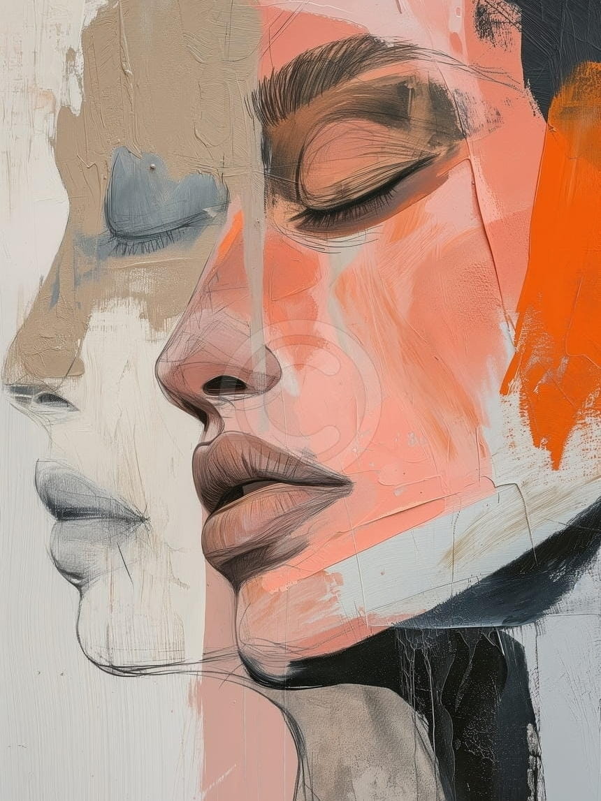 Questo quadro mostra identità e riflessione usando luce e ombra. Due volti sovrapposti, uno disegnato leggermente e l’altro dipinto con colori forti, rappresentano i due lati di una persona—quello visibile e quello nascosto, passato e presente. I colori caldi pesca e terra contrastano con il nero e bianco, creando una differenza tra presenza e assenza. Le pennellate e i dettagli astratti danno profondità, mostrando la complessità dei sentimenti e come la percezione di sé cambi nel tempo.